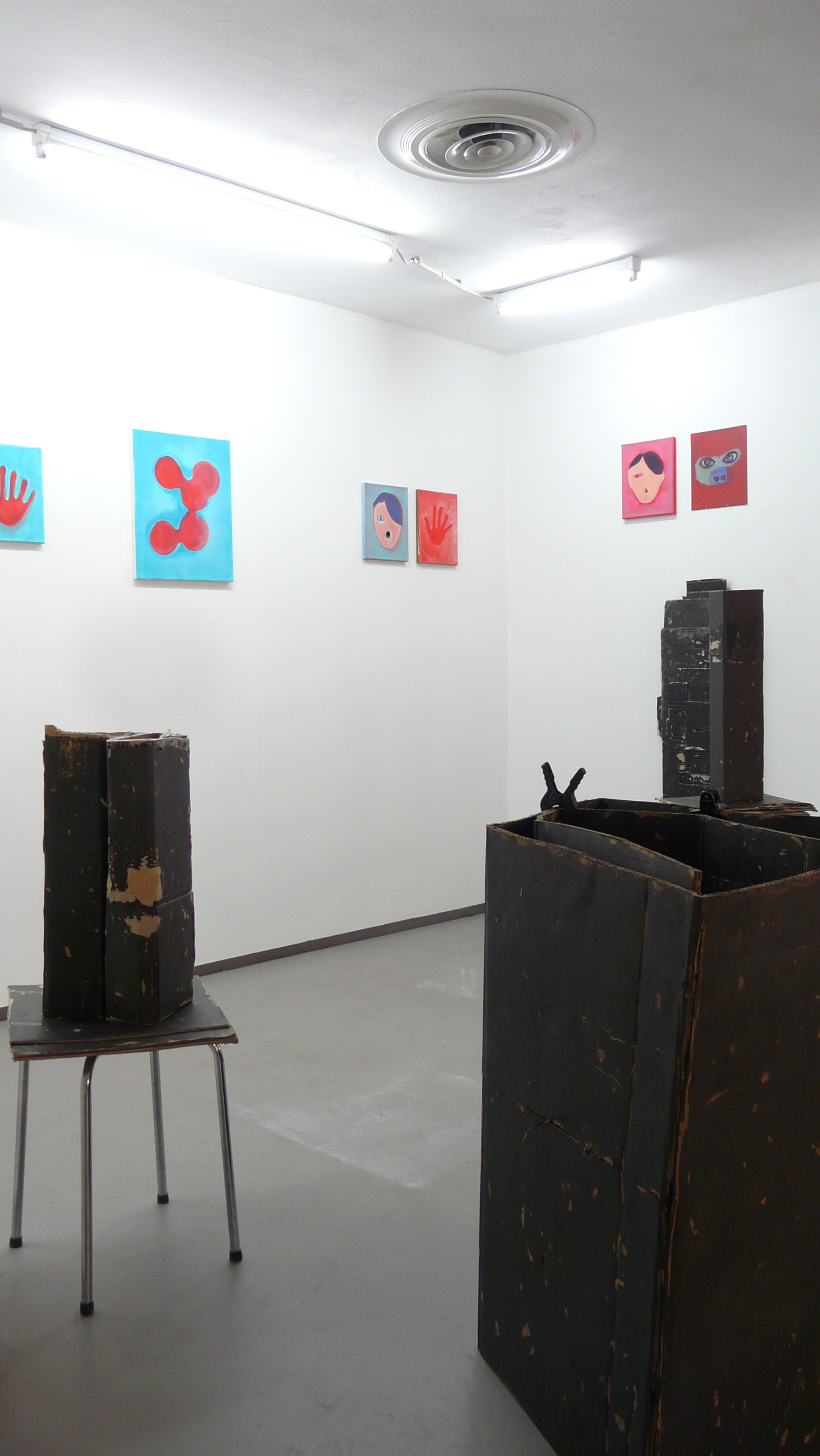 Betritt man den Raum der Projektgalerie fällt zuerst die formale Vielfalt der Ausstellung ins Auge. Kleinformatige Gemälde, gefaltete Kartonobjekte, Kleinplastiken, Fotogramme und eine Schattenprojektion, die auf die Schaufensterscheibe vor allem an das vorbeilaufende Publikum gerichtet ist.